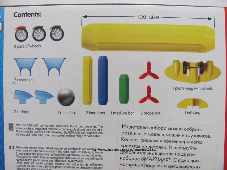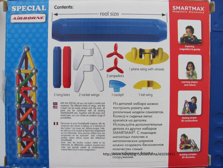 Конструктор немного необычный, если Magformers магнитится с любой стороны, любые детали, то в Bondibn -Цвета магнитных палочек указывают на их заряд: детали холодных цветов (синяя и зеленая) имеют отрицательные полюса, а теплого (желтая) - положительный. Соответственно, однополярные магниты будут отталкиваться, а противоположные - притягиваться. Это способ объяснить ребенку про свойства магнита. Шарик полый, а его корпус сделан из легкого металла,он выполняет роль "переходника", к нему магнитятся все палочки. Колеса-шасси закреплены на металлической оси и обуты в настоящие резиновые шины. Пропеллеры на магнитах.