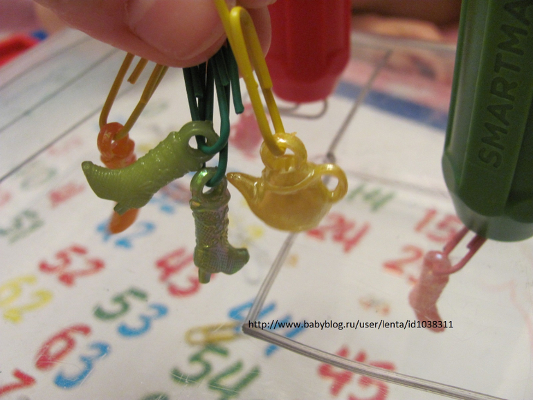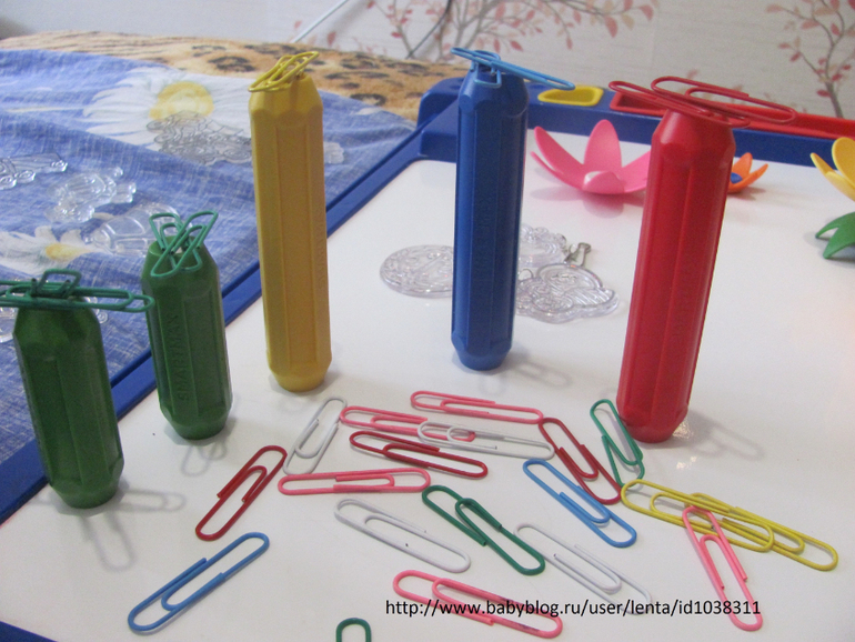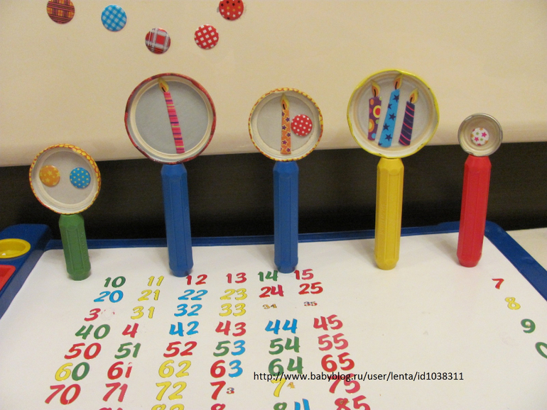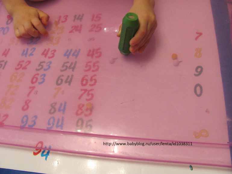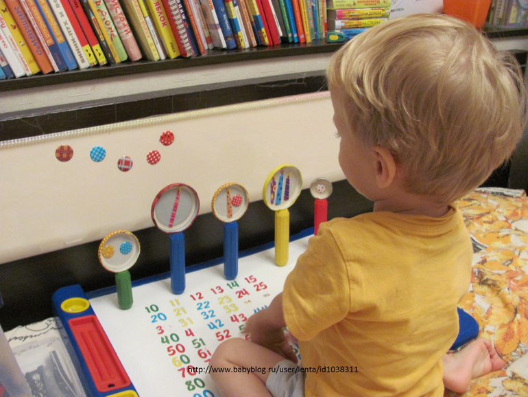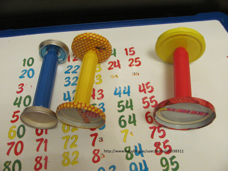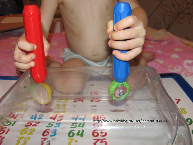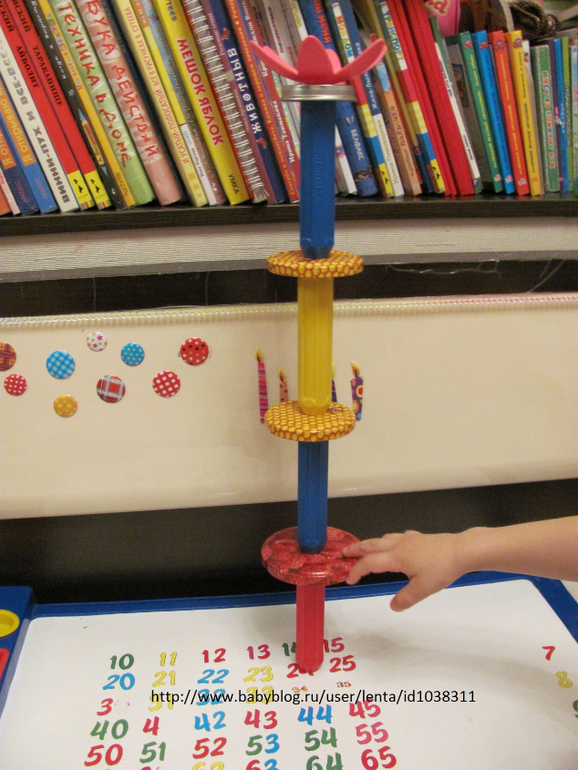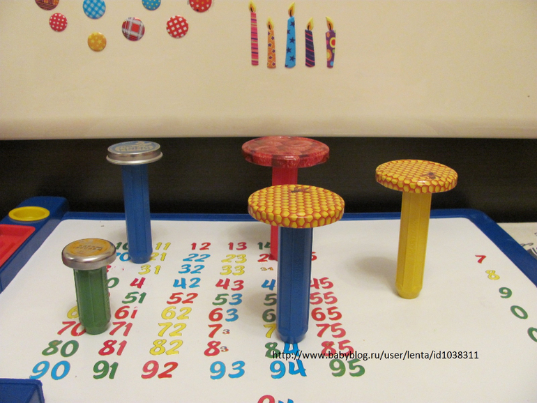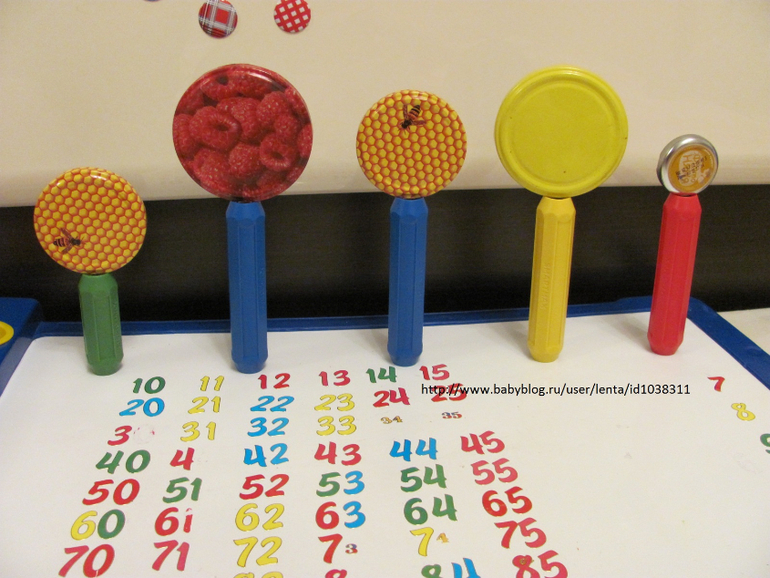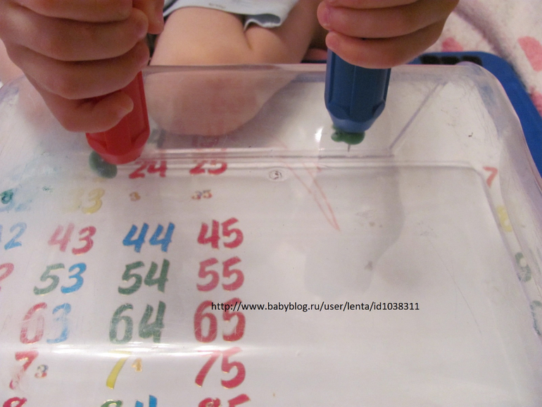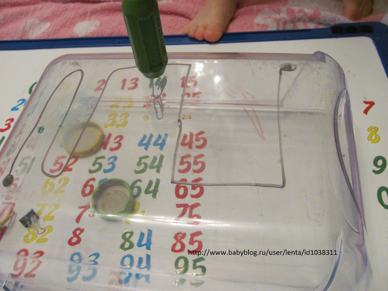 На крышке от контейнера для игрушек. Задание переместить гвоздики с любым числом по цвету.