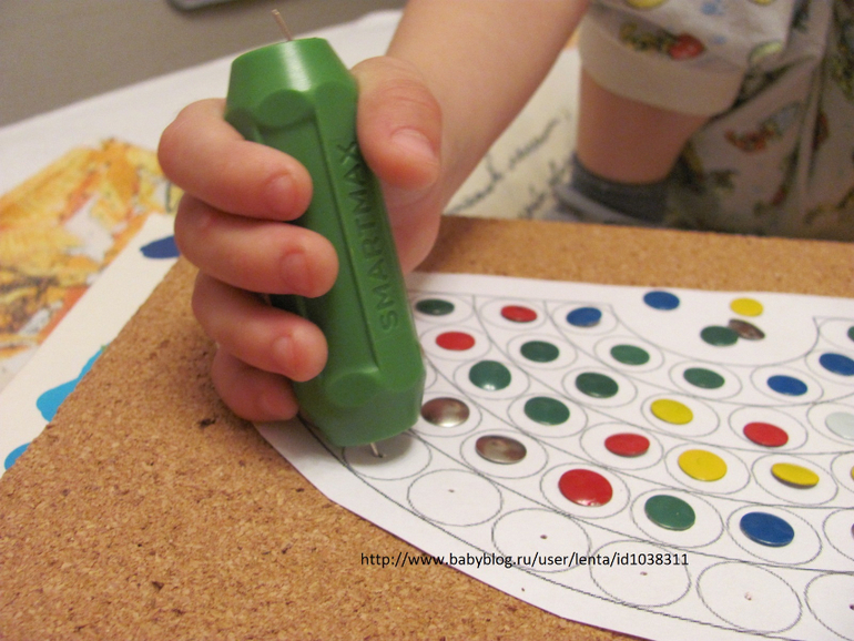 Еще играем в подобие "магнитного лабиринта" - в прозрачный пластиковый контейнер кладем гвоздик, контейнер переворачиваем, и палочкой ведем гвоздик по маршруту (что-то типа дорожек). Суть игры : гвоздику необходимо дойти до нужной цели, не упав. И фантазируем-можно взять гвоздик одного цвета, а сделать два финиша - но правильный тот,который подходит к цвету гвоздика. Или гвоздик - это детеныш и нужно прийти к маме. Усложняем, например зайчонок идет к зайчихе, а на пол пути волк-нужно обойти (это самая любимая дорожка). Хочу попробовать задействовать вторую руку, например - волк все-таки унес зайчонка(держит рукой этот гвоздик), и на помощь приходит ежик (второй гвоздик) и работаем второй рукой.