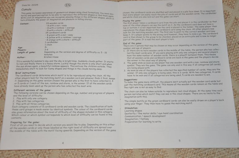 Правила предельно просты: игроки по очереди берут по картонной карточке из стопки, кладут ее на подставку, чтобы она была не видна для других игроков, и пытаются с помощью цепочки воспроизвести форму облака, которая на ней изображена. Остальные игроки при этом должны угадать ее и схватить соответствующую деревянную карточку (играя вдвоем, скорость не имеет значения)).
