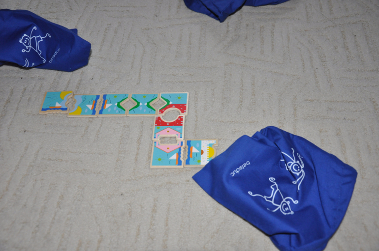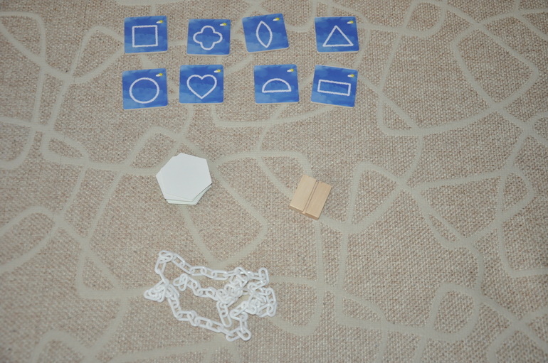 Перед началом игры раскладываем квадратные деревянные карточки картинкой вверх в центре игрового поля.