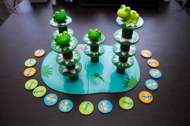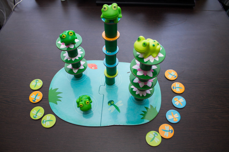Мы же в ходе наших игр порой используем и сами жетоны для строительства. Исходя из нашего опыта я бы со 100% уверенностью рекомендовала бы данную игру месяцев с 10 по упрощенным правилам. Для более старших деток можно усложнить правила, для этого из игры исключаются некоторые места для расположения свай: на 1,2 или 3 кружочка в воде ставятся лягушки. Таким образом, ограничивается количество мест для расположения свай, и поэтому пирамиды получаются более высокими.