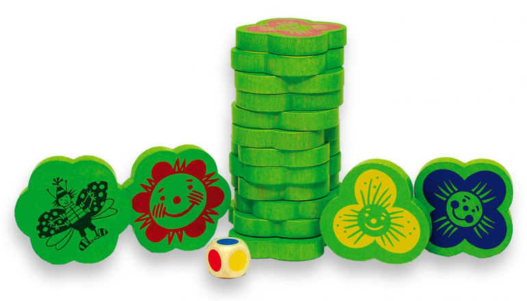 - Состав игры: 16 деревянных жетонов цветков и цветной кубик.
