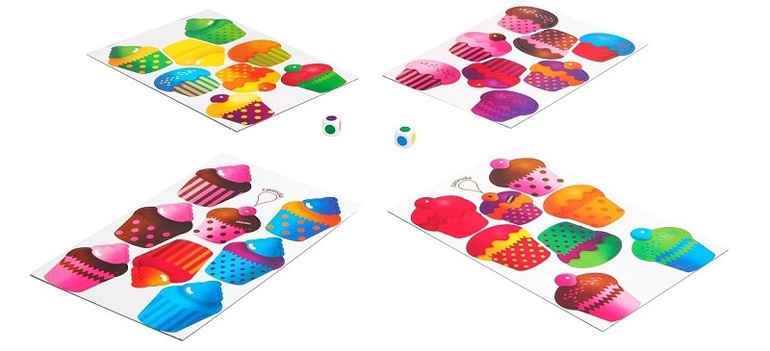 Играть в нее весело и совсем несложно: участники по очереди кидают две игральные кости, на гранях которых вместо цифр размещены разноцветные кружочки. Если среди кексов присутствует выполненные в выпавших цветах, игрок забирает его себе, причем сделать это он должен как можно быстрее!