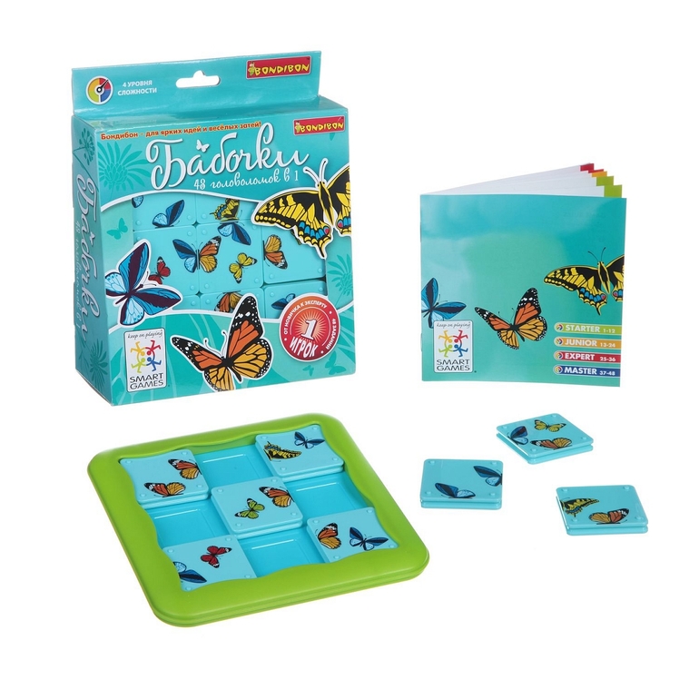 "Сможете ли вы задействовать всю свою логику и создать ярких красивых бабочек из случайных частей? Эта яркая и красивая головоломка включает в себя 48 заданий, простых для новичков и сложных для настоящих экспертов. Единственное, что будет неизменно на каждом из уровней - вам нужно будет создать из предложенных деталей пазла ярких и уникальных бабочек! Игра предназначена для путешествий, она компактна и имеет отсек для хранения частей пазла и буклета с заданиями."