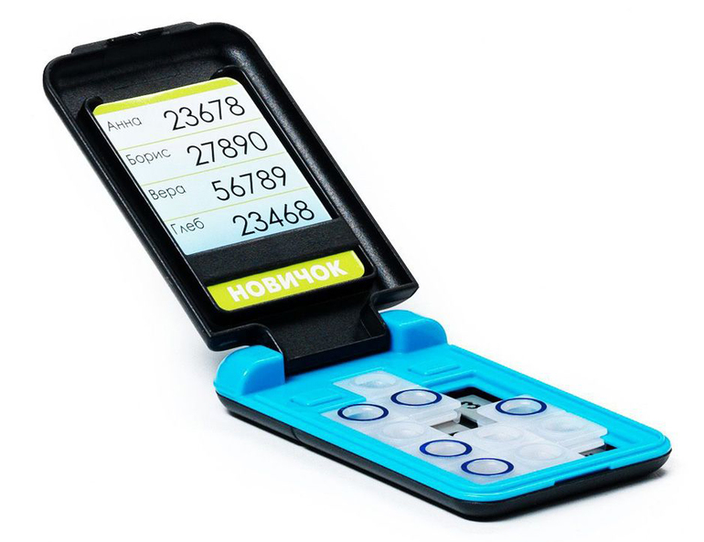 В набор входит: компактный телефон с передвигающимися кнопками, 32 задания (разные уровни сложности).
