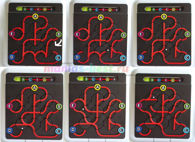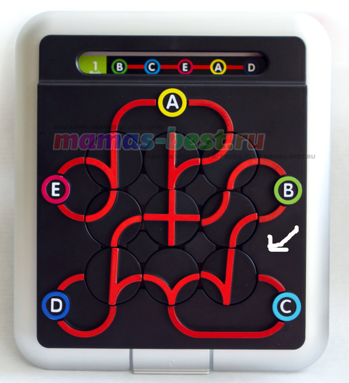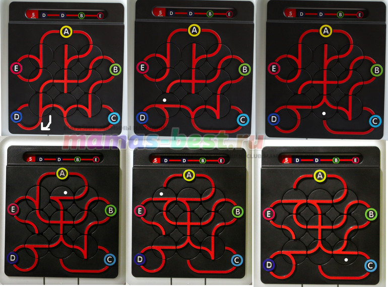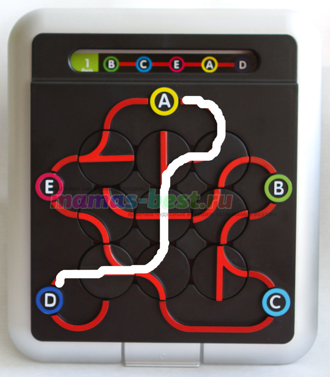 Переворачиваем карточку. Задание, уровень сложности Эксперт. (всего в каждом уровне 16 заданий) Прокладываем путь D-D-B-E. Обратите внимание на правило "на перекрестке дорог поезд может ехать только прямо, не сворачивая влево или вправо", здесь и в задании ниже, оно очень пригодится.