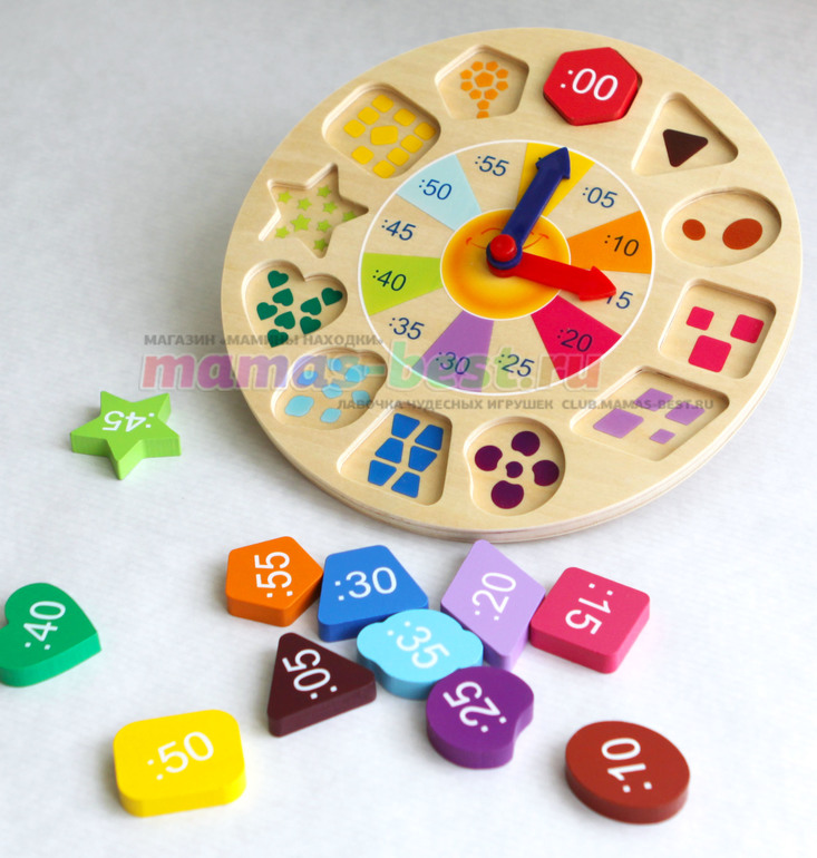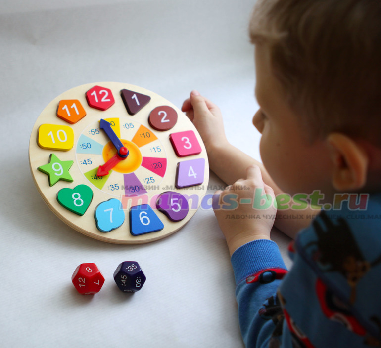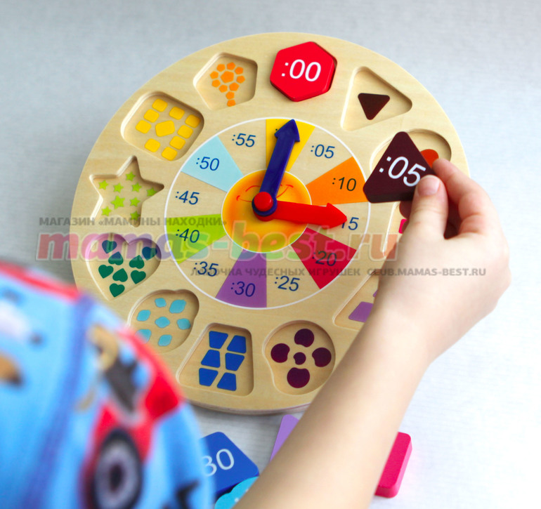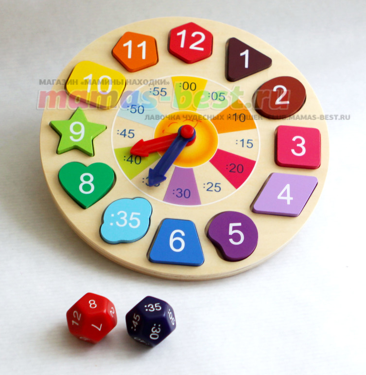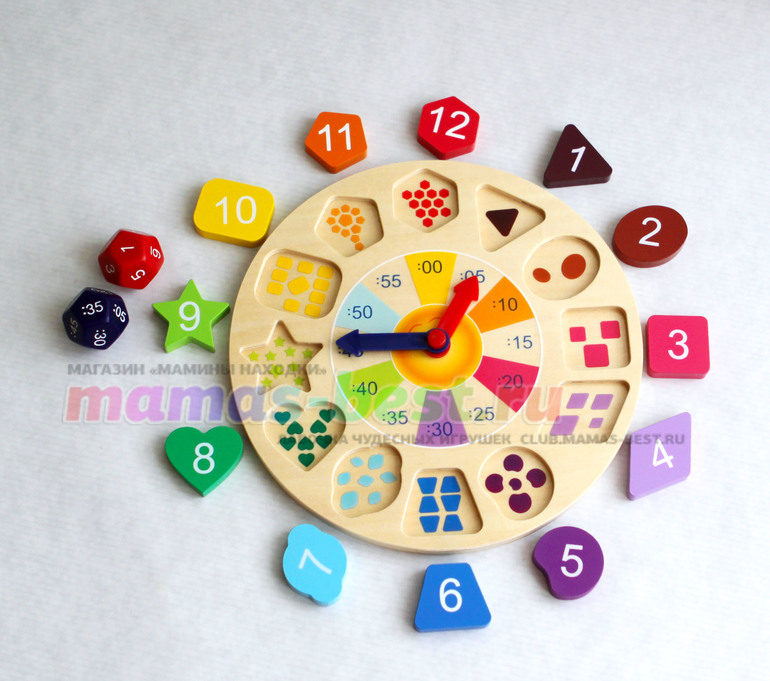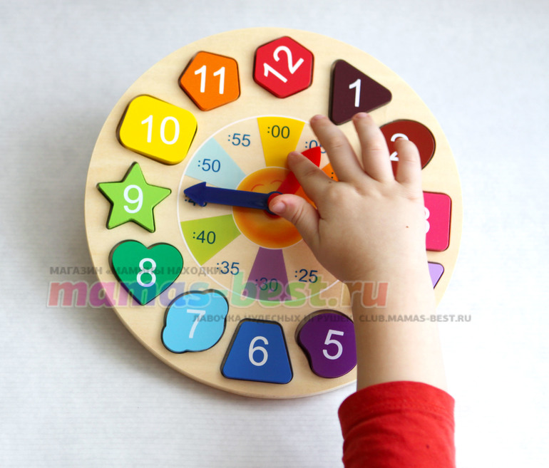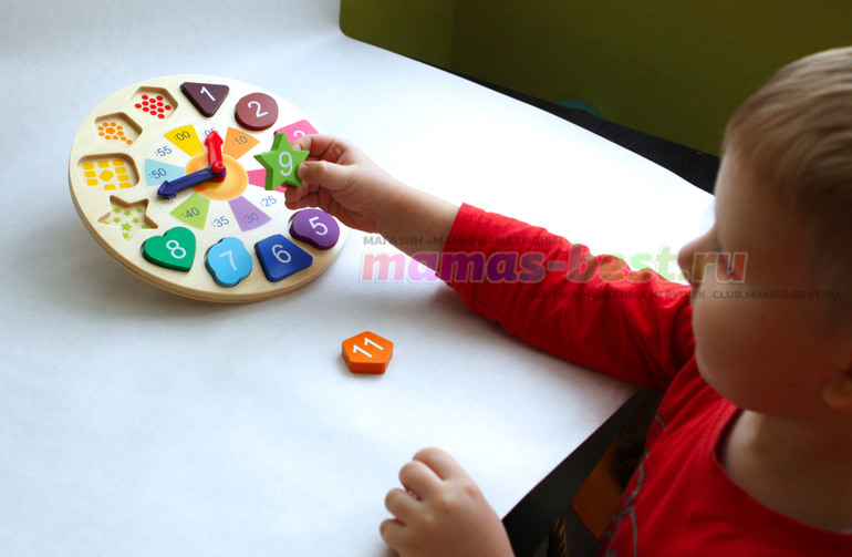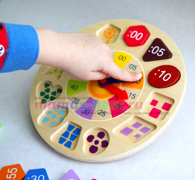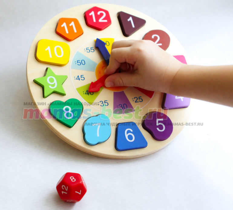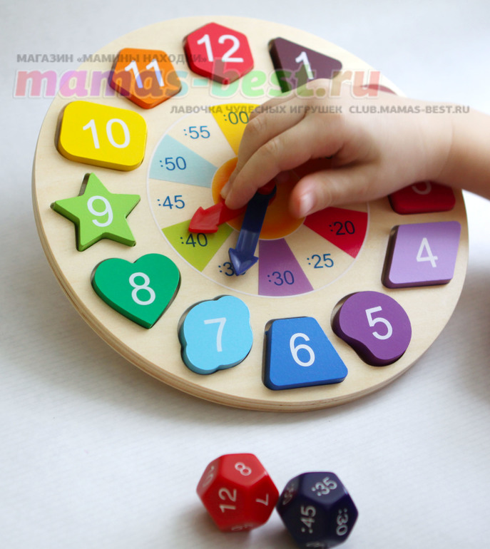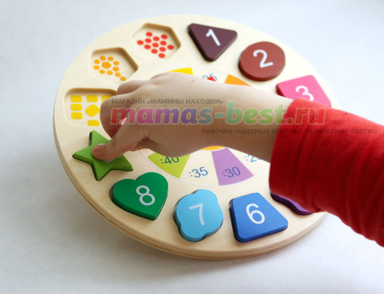 Задача состоит в том, чтобы малыш вложил их в часики в соответствующие поля.