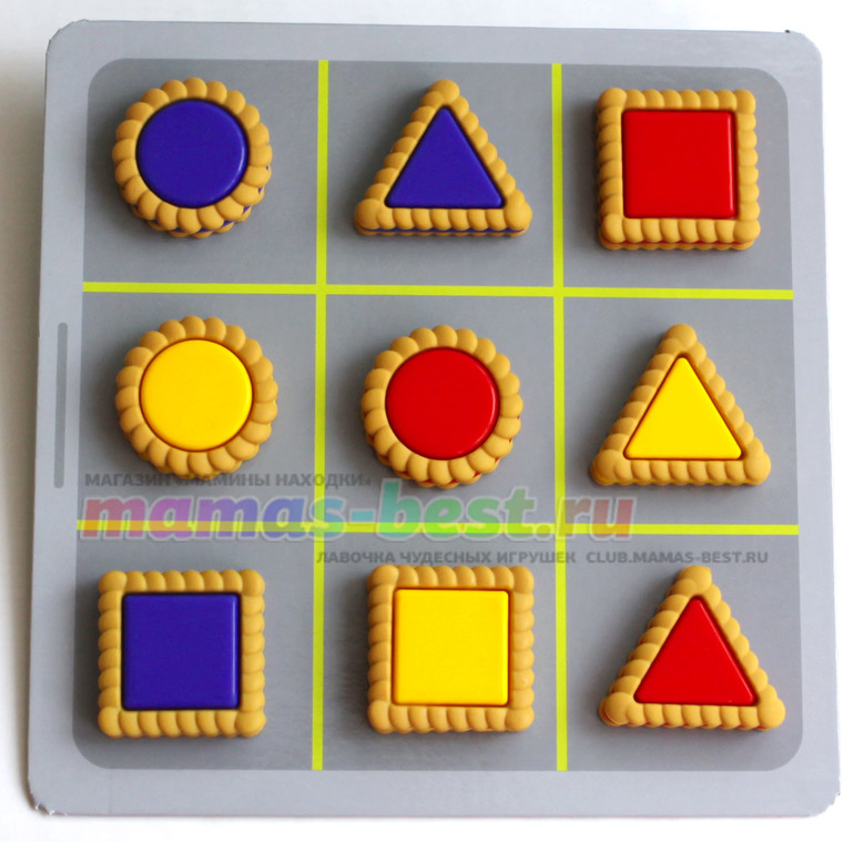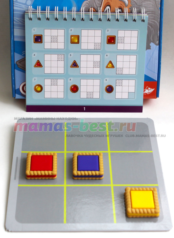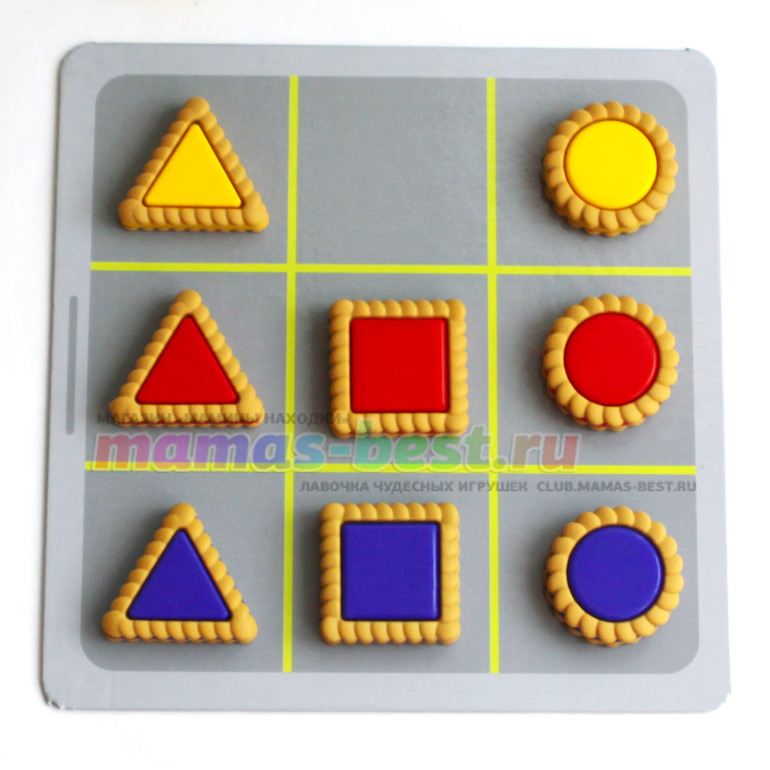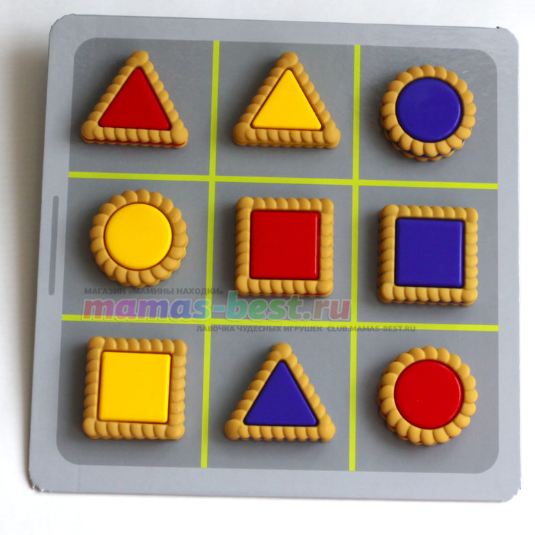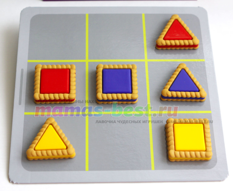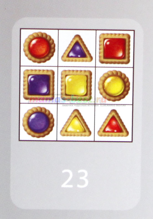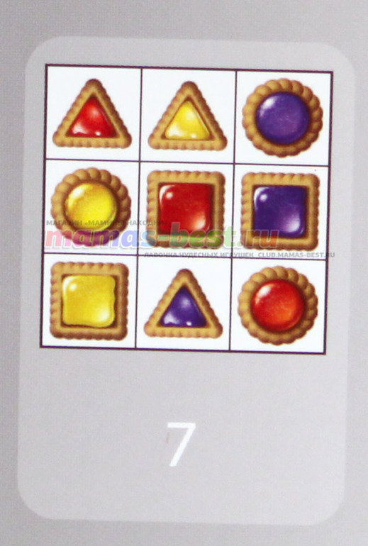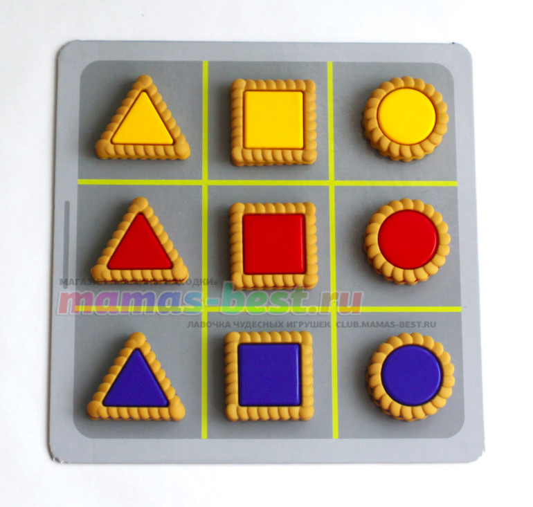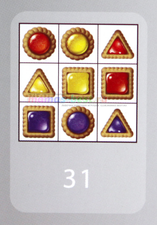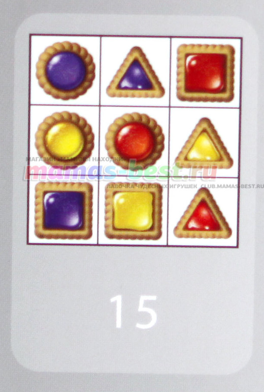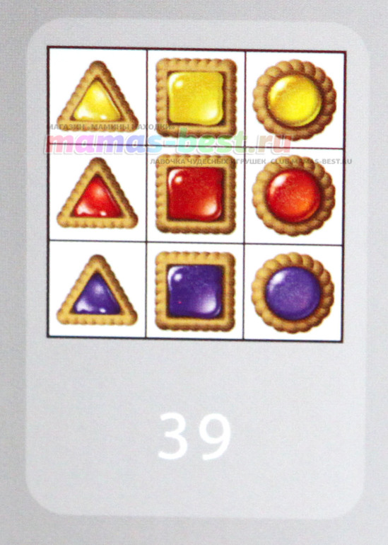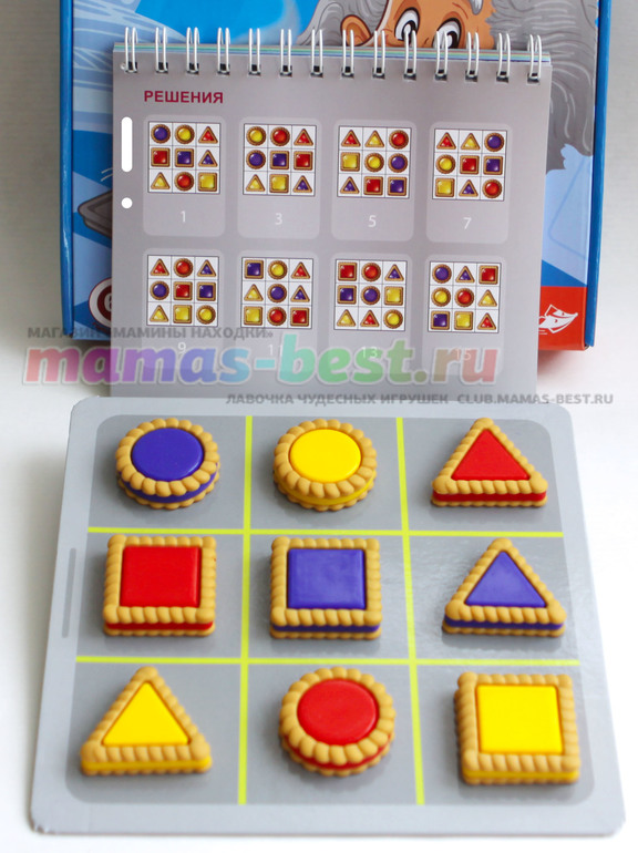 Внутри яркой коробочки вас ждет: 9 печений, представленных в трех цветах и трех геометрических фигурах, 1 поднос разделенный на ячейки, брошюра с 64 головоломками и ответами, правила игры.