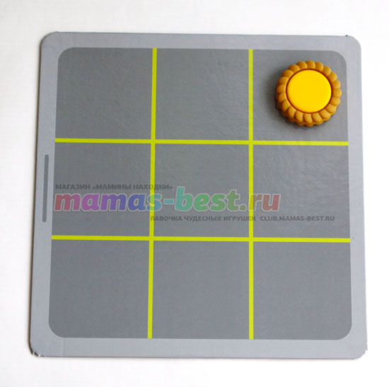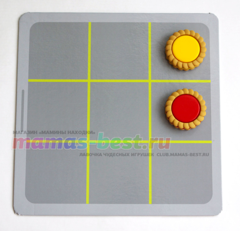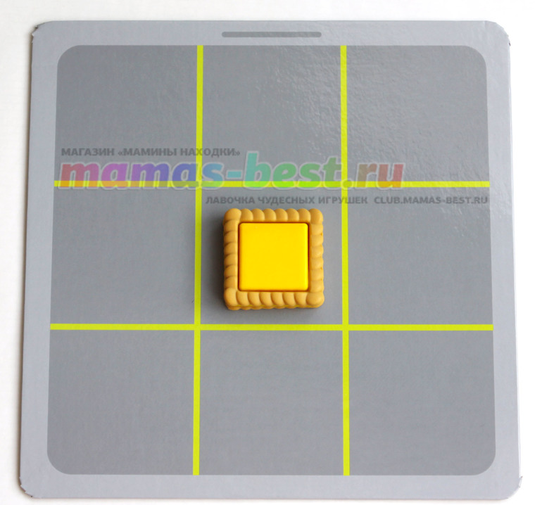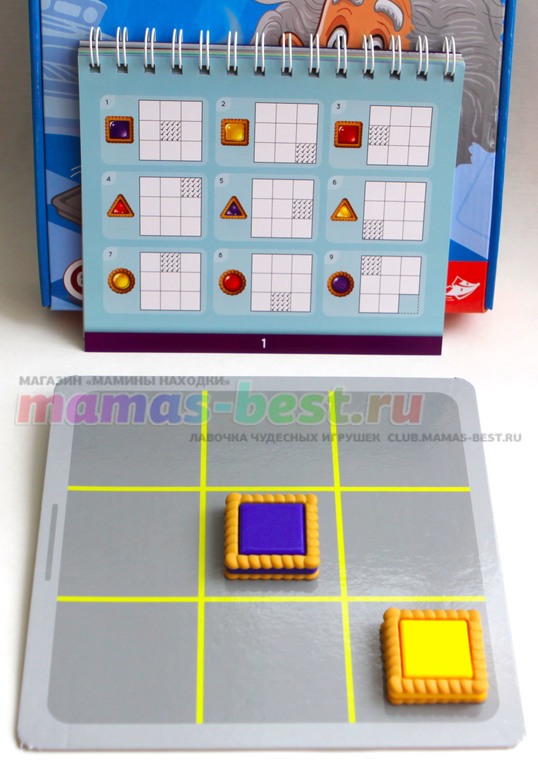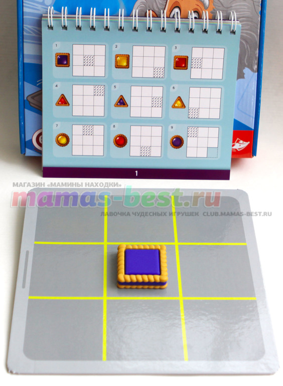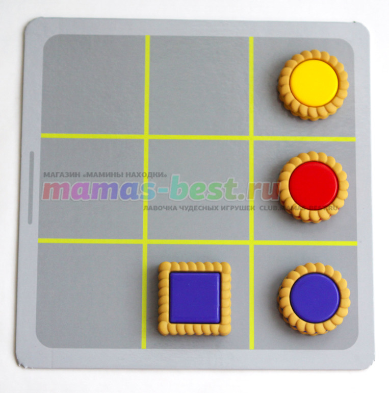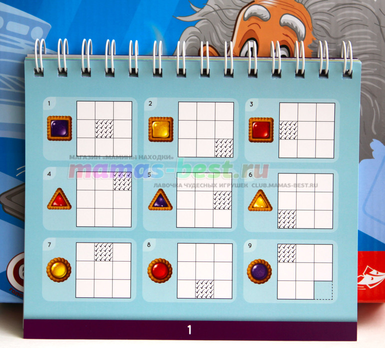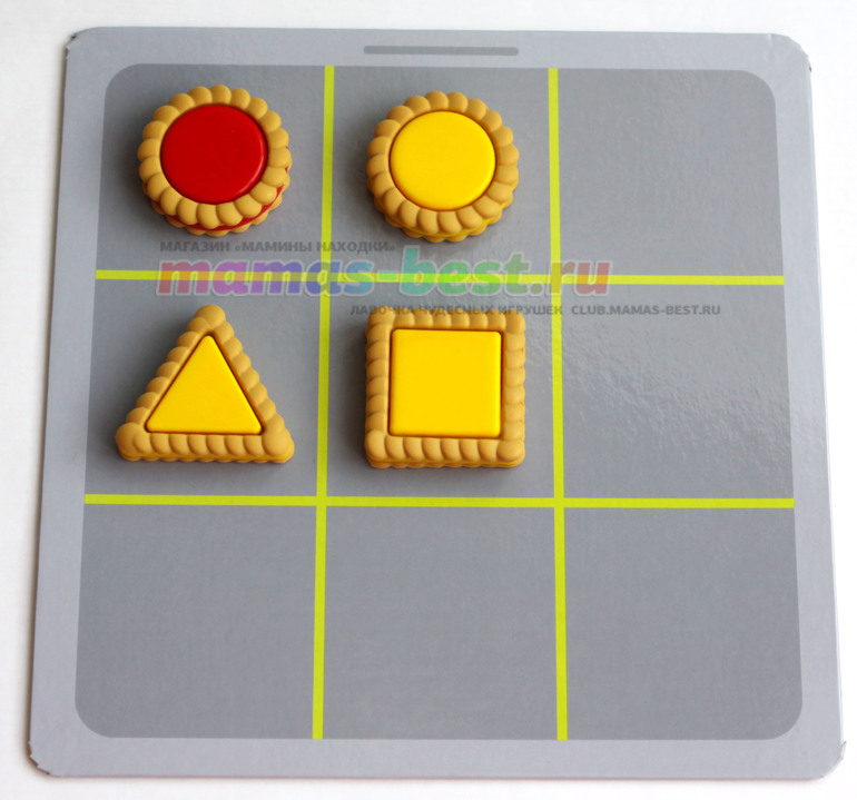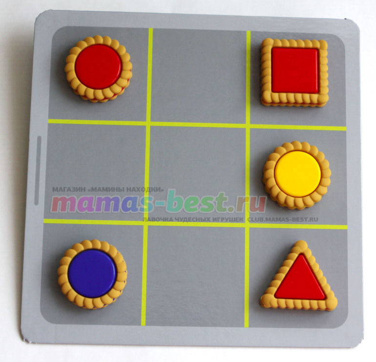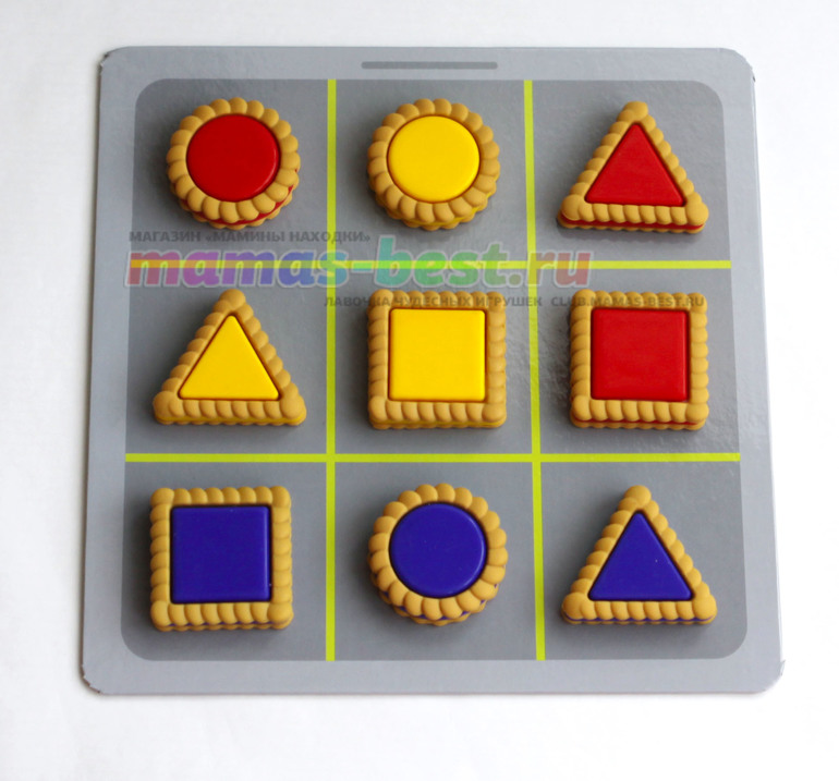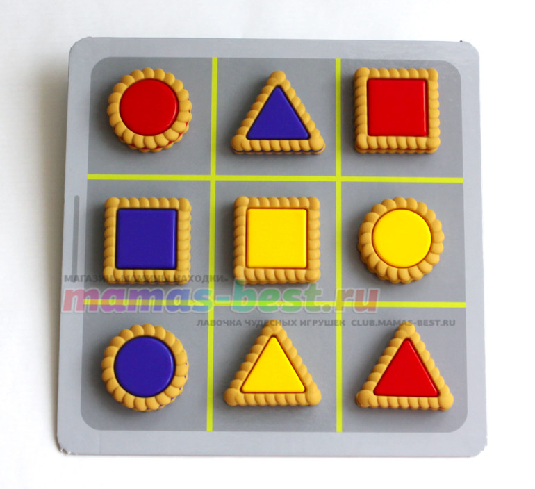 Внутри яркой коробочки вас ждет: 9 печений, представленных в трех цветах и трех геометрических фигурах, 1 поднос разделенный на ячейки, брошюра с 64 головоломками и ответами, правила игры.
