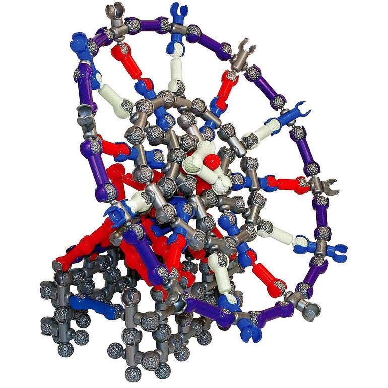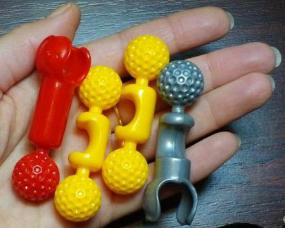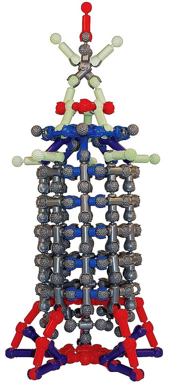 Каждая из деталей представляет собой короткие пластмассовые стержни, которые отличаются друг от друга цветом и строением. Красные - с одной стороны шарик, с другой - гнездо, синие - с обоих концов детали и посередине - гнезда, салатовые - с обоих концов гнезда, серые - на одном конце шарик на другом конце и по центру детали - гнезда, желтые - с обоих концов шарики а по центру гнездо. Каждая деталь длиной 6,5 см.