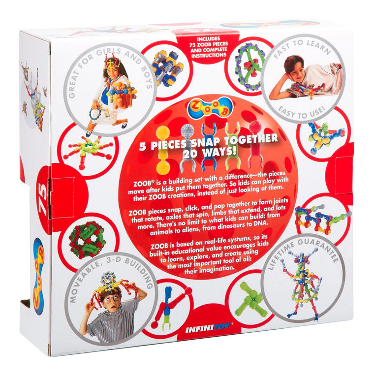 Infinitoy гарантирует высокое качество и безопасность материалов, из которых производятся конструкторы ZOOB. Конструкторы полностью соответствуют стандартам, разработанным Американским обществом специалистов по испытаниям и материалам (ASTM International), а также более жестким Европейским стандартам EN-71. Все детали сделаны из пластика и соединяются различными замковыми способами без применения магнитов. Конструкторы очень качественно упакованы и снабжены подробнейшими инструкциями по сборке моделей.