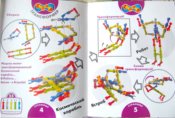 Набор содержит: 75 деталей Zoob и 4 книжечки с пошаговыми инструкциями.