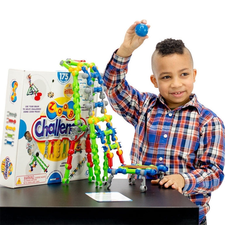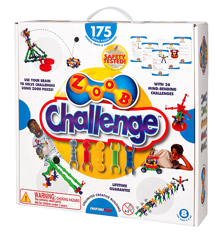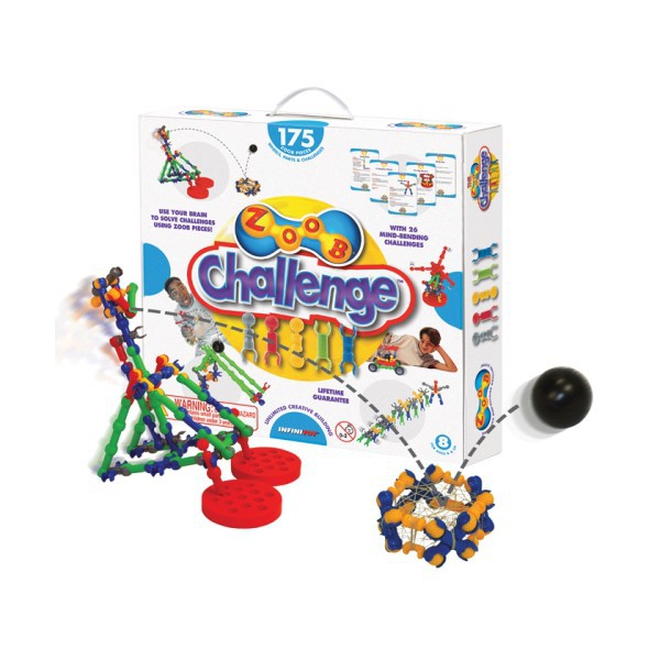 Набор содержит карточки с 26 оригинальными заданиями, нацеленными на совершенствование конструкторских навыков детей. При этом каждое задание имеет несколько решений с использованием 175 деталей ZOOB и дополнительных элементов. Юный инженер и его друзья будут с удовольствием играть с набором ZOOB Challenge Kit и находить все новые и новые способы решения заданий.
