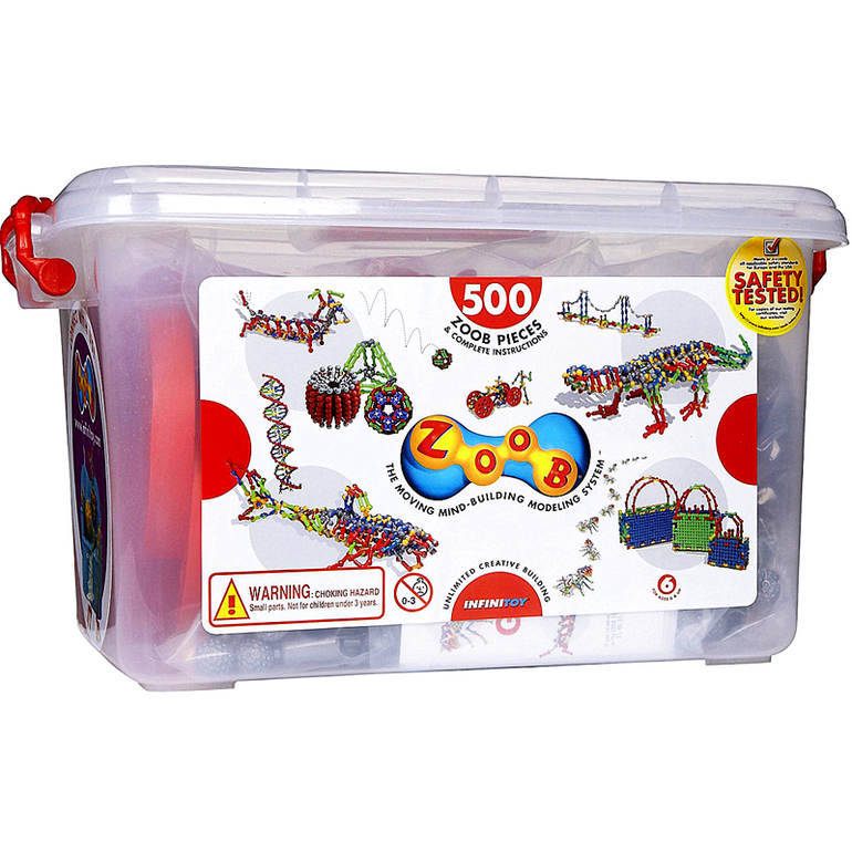 Набор содержит: 500 разноцветных деталей Zoob, 6 книжечек с пошаговыми инструкциями и контейнер для хранения.