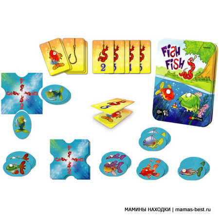 Игра содержит: карты рыбалки, карты наживки, жетоны рыб, карточки добычи, блокнот для подсчета очков и карандаш.