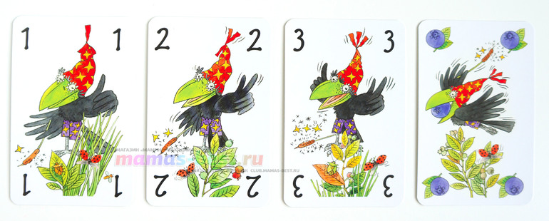 Обратите свое внимание на перья, которые поднимает вверх ворон, их количество совпадает с номером на карте. Тем самым, игра подходит деткам, которые не знают как пишутся цифры, а могут только сосчитать 1,2,3.