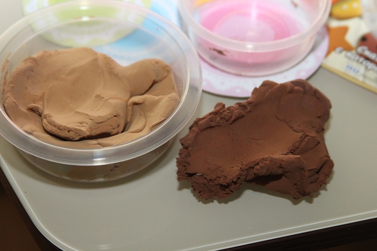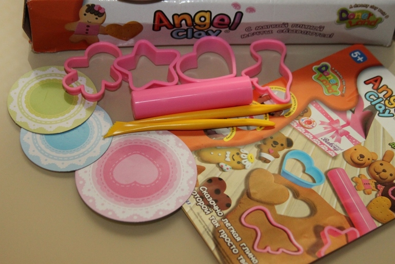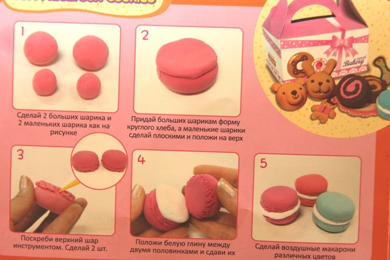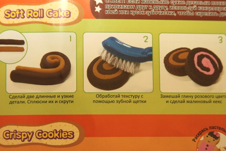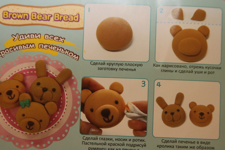 Что в коробке: глина 3 цветов (шоколадный, белый, коричневый), инструкция, инструменты (формочки, стека и тп), картонная коробочка под печеньки, 3 картонные "салфеточки" под печенье.