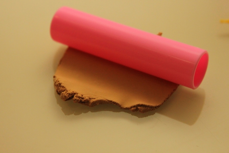 Добавляем украшение, делаем инструментом дырочки печенюшные (сиреневые спиральки: белая глина+сиреневый фломастер, в наборе те 3 цвета, что в начале в баночках)