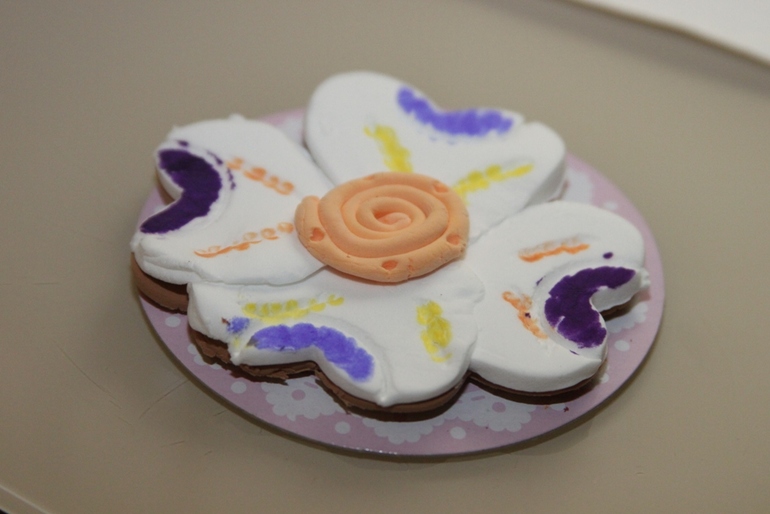 Кайфует дочка от того, что ее и красить можно поверх изделия (розовое у человечка, например, было сделано из белой глины, потом поверх подсохшей прошлась фломастером) и от того, что цвет белой можно поменять на любой другой. Хоть однородный (как мы в прошлой теме наэкспериментировались), хоть вот такой мраморный-с разводами, как на пироженке ниже).