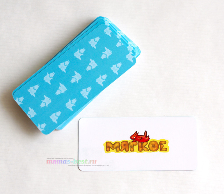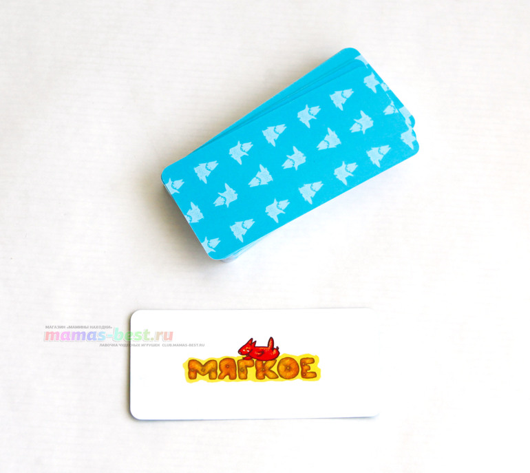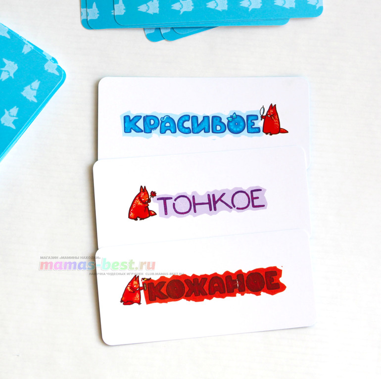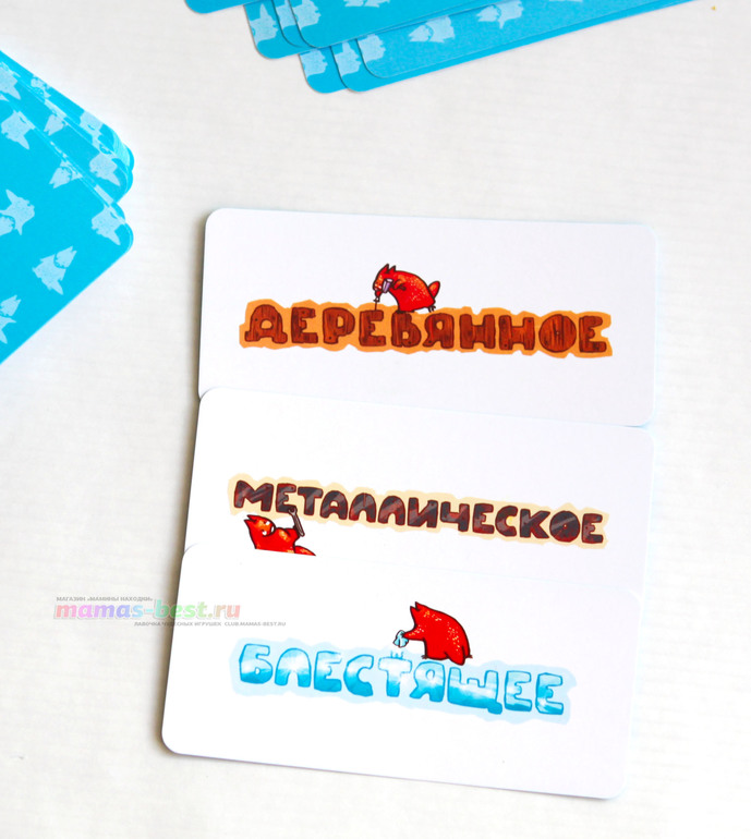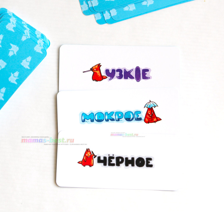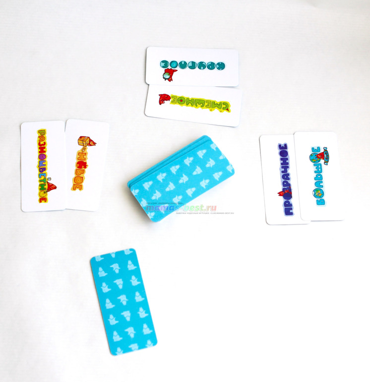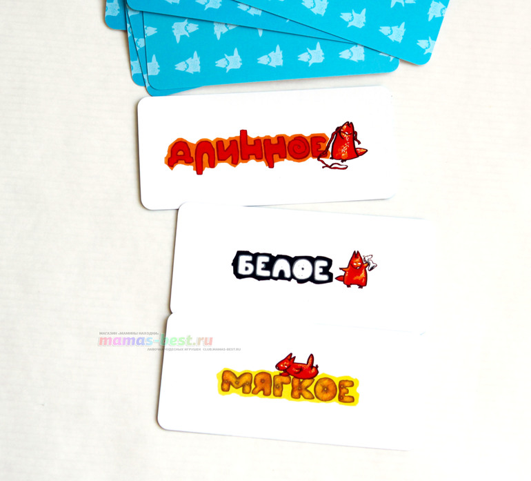Перемешанную стопку кладем рубашкой вверх. Первый игрок открывает карту и читает слово, поясняем его малышам. Игрок называет реальное существо, предмет или явление с таким свойством. Карта остается лежать открытой перед участником.