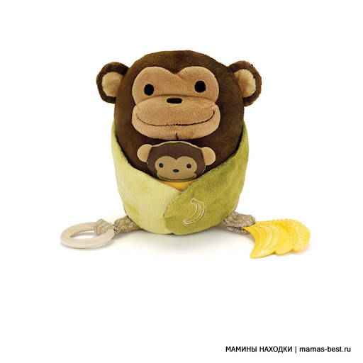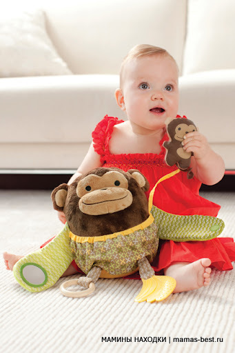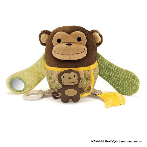 Набор Skip-Hop Hug&Hide Activity Toy состоит из 2х игрушек (маленькая вмещается в кармашек большой). Маленькая обезьянкак прячется в кармашке на животе у большой, которая может обнять малыша (на лапках у нее безопасные "липучки"). Малыш не потеряется, он прикреплен к маме при помощи ленточки. К большей игрушке-погремушке на липучке прикреплены прорезыватели (деревянный и пластиковый) для зубов, в любой момент их можно снять и помыть. Лапки большой игрушки на липучках закрывают безопасное зеркальце.