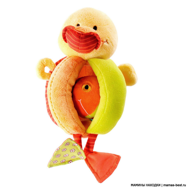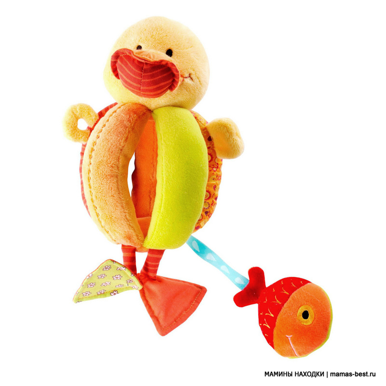 А главное развлечение - это цветная рыбка-колокольчик, которая прикреплена к утенку яркой тесемкой. Эта мягкая рыбка в форме шарика может играть с малышом в прятки! А прячется она в животике у утенка (между дугами).