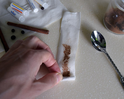 И, конечно, специи! Вот уж чего-чего, а богатство мира приправ изучить стоит, это, может, аромат флёр д'оранжа в жизни не пригодится особо, а уж корицу с перцем стыдно не знать! Лучше брать порошки, т.е. молотые специи, они сильнее пахнут и не гремят в баночках. Технология: отрезать салфетную дорожку, насыпать на неё порошка в середине, скрутить в рулончик, аккуратно - чтоб не просыпалось со срезов, поместить в тубу.