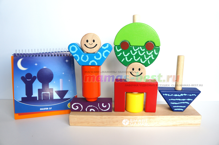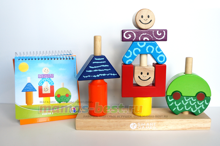 В набор входят: основа с тремя штырьками, 10 элементов пазла и буклет с правилами игры на русском языке и заданиями для сборки.