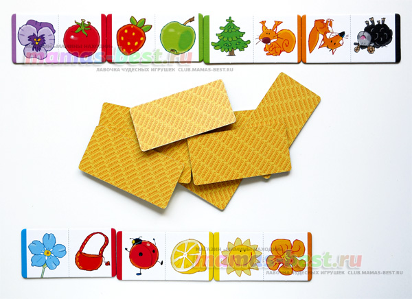 В наборе малыш найдет 28 ярких карточек. Игра начинается с того, что каждому игроку раздается по 6 карточек. Далее игроки последовательно должны выложить карточки с одинаковыми соприкасающимися картинками.