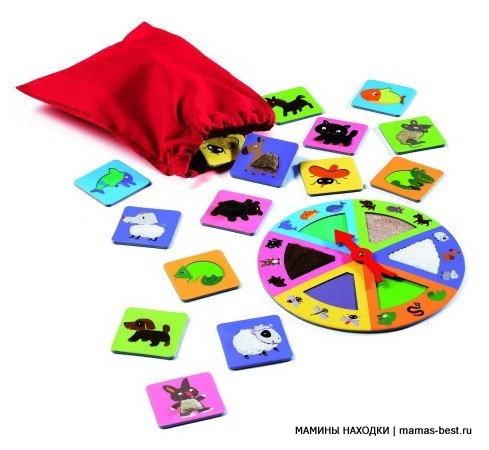 В набор входит игровое поле со стрелкой и 15 разноцветных фигурок (курочка, овечка, фрукты-овощи, лейка, тачка и пр.). Теперь можно научиться различать предметы не только видя их, но и изучить каждый на ощупь.