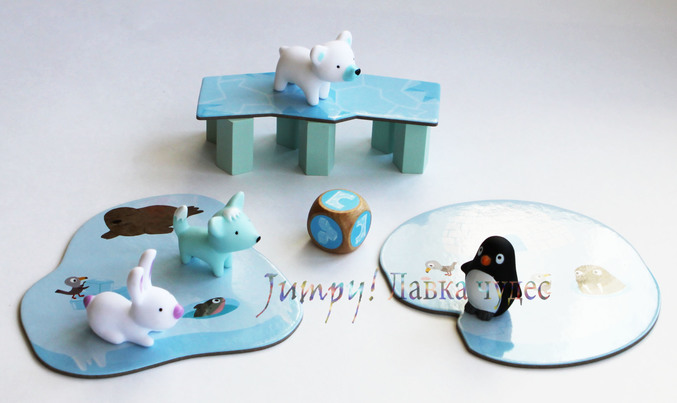 Итак, игровое поле состоит из: двух льдин, одна из которых и является той самой заветной "хижиной", между ними на шести опорах стоит мост. Размещаем 4 животных на поле "рыбалка" около проруби.
