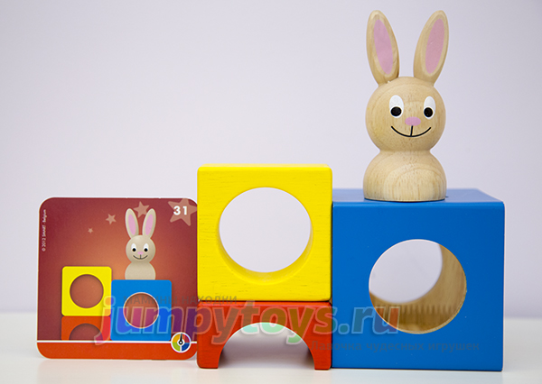 Поиграем в прятки! Расположи все 3D-детали головоломки таким образом, чтобы выполнить задание на карточке. Из какого окошка выглядывает кролик: из круглого или звездообразного? На блоке какого цвета стоит: желтого, красного или синего? Некоторые задания могут выглядеть похожими, но их решения оказываются абсолютно разными.