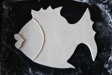 На раскатанное тесто накладываем рисунок рыбы и вырезаем острым ножом по контуру.