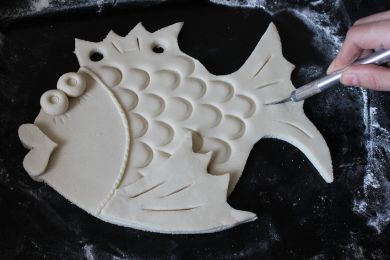 Для того чтобы создать узоры, украшения, рельеф на тесте, можно использовать все что угодно, любые подручные средства. Например, с помощью обычной ложки для обуви делаем чешуйки, соломинкой для коктейля проделываем различные дырочки, колпачком от фломастера - отверстия для ленточки.