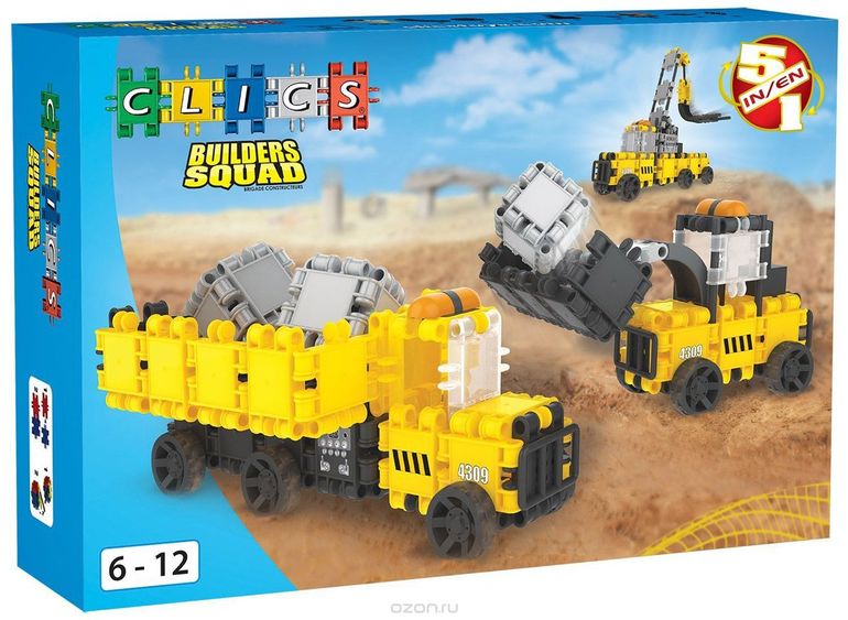 4. Недавно купили очень интересный набор "Строительные машины" от Clics. Единственно, одновременно можно собрать только одну машину, т.к. в наборе всего шесть колес и три оси! Но конструктор понравился, хотя ребенок сам еще не собирает, идея необычная и позже будем покупать другие конструкторы этой фирмы. А главное - в собранную машину можно играть часами и она не развалится даже после падения с дивана или со стола.