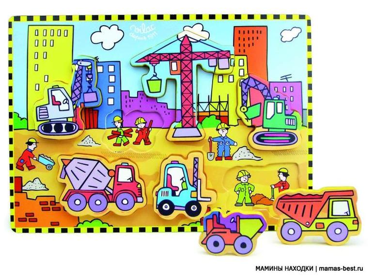 Пазл-рамка "Стройка" от французской компании Vilac - замечательный развивающий набор в виде красочного деревянного пазла с машинками.