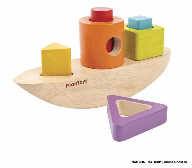 Развивающая игрушка Plan Toys подходит для игр детей от 1,5 лет. Сортировка выполнена в виде лодочки со съемными вертикальными деревянными частями, на которые малыш должен надеть различные геометрические фигурки.