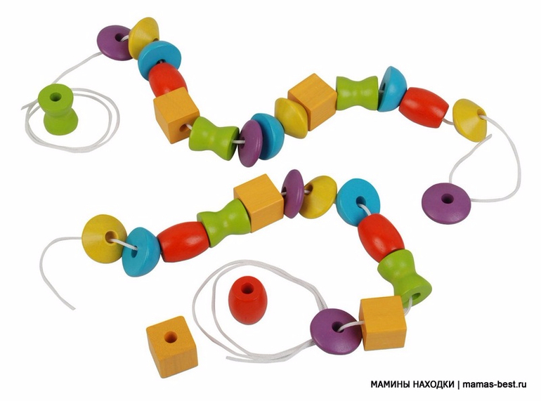 Нанизывая бусины на шнурок, получаются красивые бусы. Один комплект включает в себя 2 шнурка и 30 деревянных бусин шести различных форм и цветов.