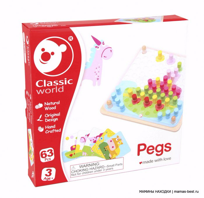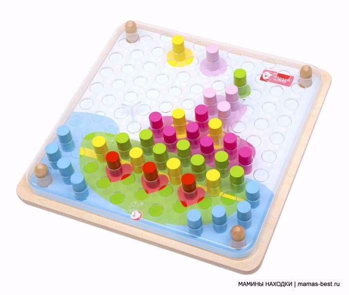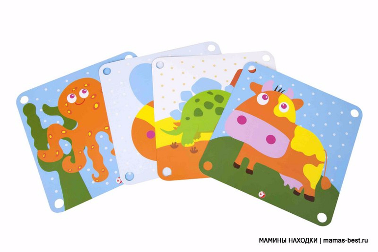 Милые персонажи порадуют вашего ребёнка: очаровательная корова, таинственный осьминог, загадочная лошадка, прелестная бабочка и живописный кораблик. По условиям игры необходимо расставить колышки согласно цветам на карточках. А также ребенок сможет придумать разнообразные истории о милых персонажах, что прекрасно способствует развитию творческого мышления.
