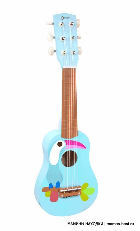 Яркая и необычная гитара для маленькой звездочки. Инструмент из натурального дерева с красивым туканом на корпусе имеет 6 настраивамых струн и мелодичное звучание. Оптимальные пропорции и размер для детских рук.