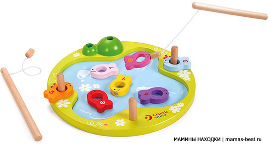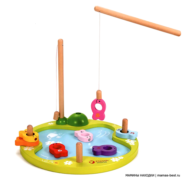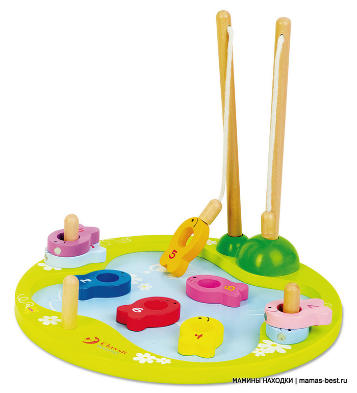 Для самых маленьких голубой пруд - игровое поле, которое можно использовать как пирамидку, ведь на нем расположены штырьки, на которые можно нанизывать цветных рыбок.