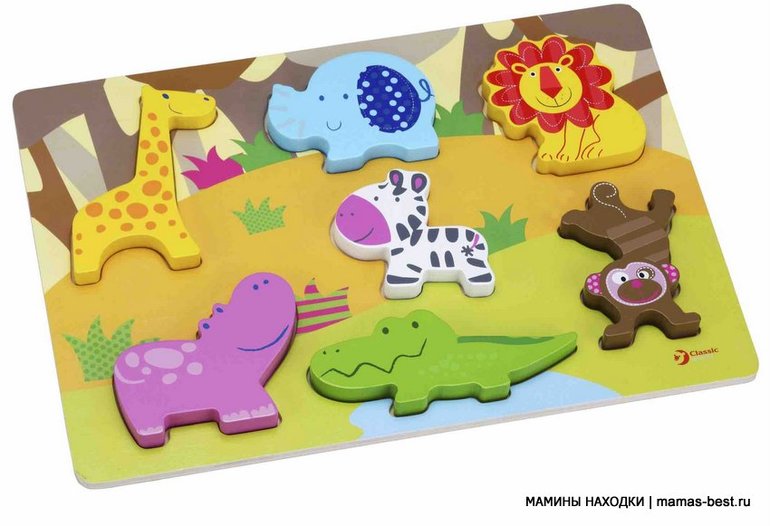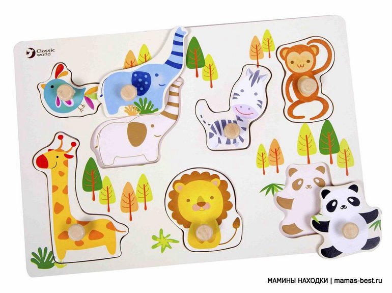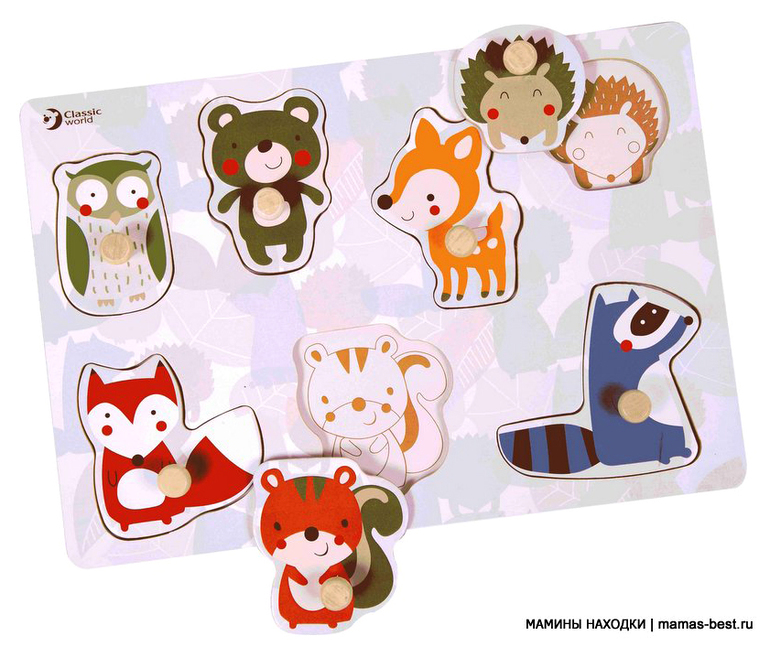Необходимость расставить фигурки на игровом поле по силуэтам развивает логику, мышление и внимательность. Удобные деревянные ручки тренируют кисть ребенка, а подсказки на основе помогут справиться с заданием.