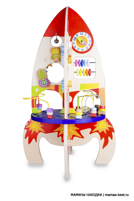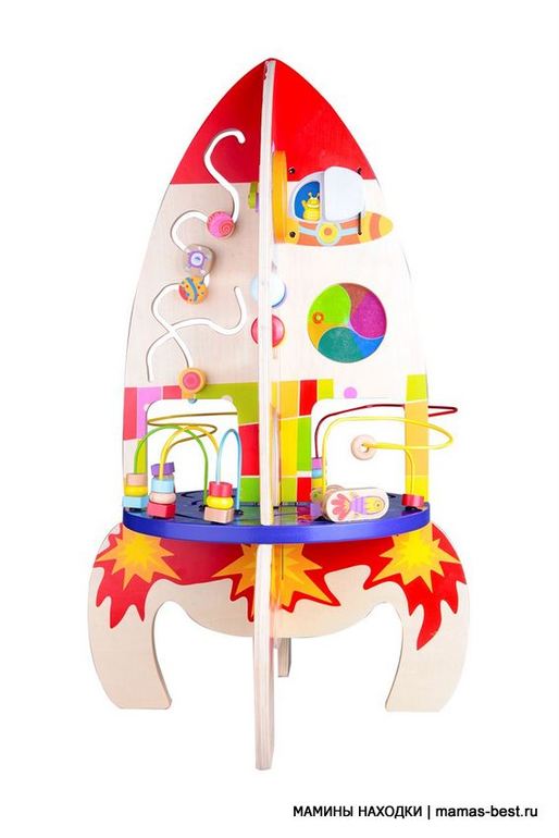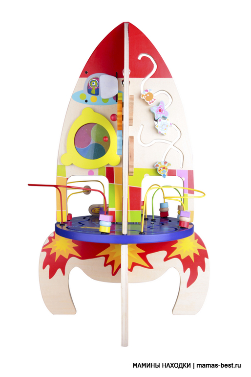 Ракета представляет собой многофункциональный развивающий центр, который включает в себя: увлекательный лабиринт, счеты, зеркальце, визуальные шестеренки, колокольчик.