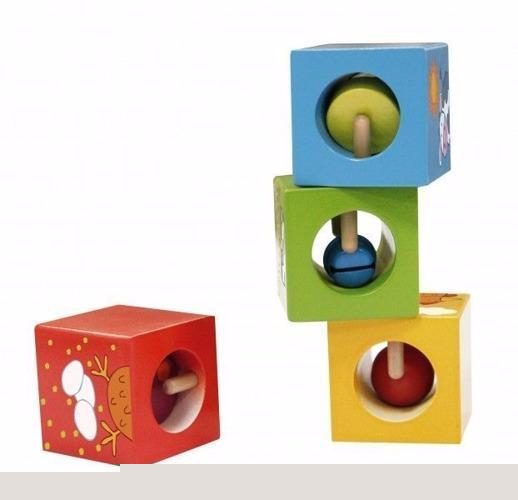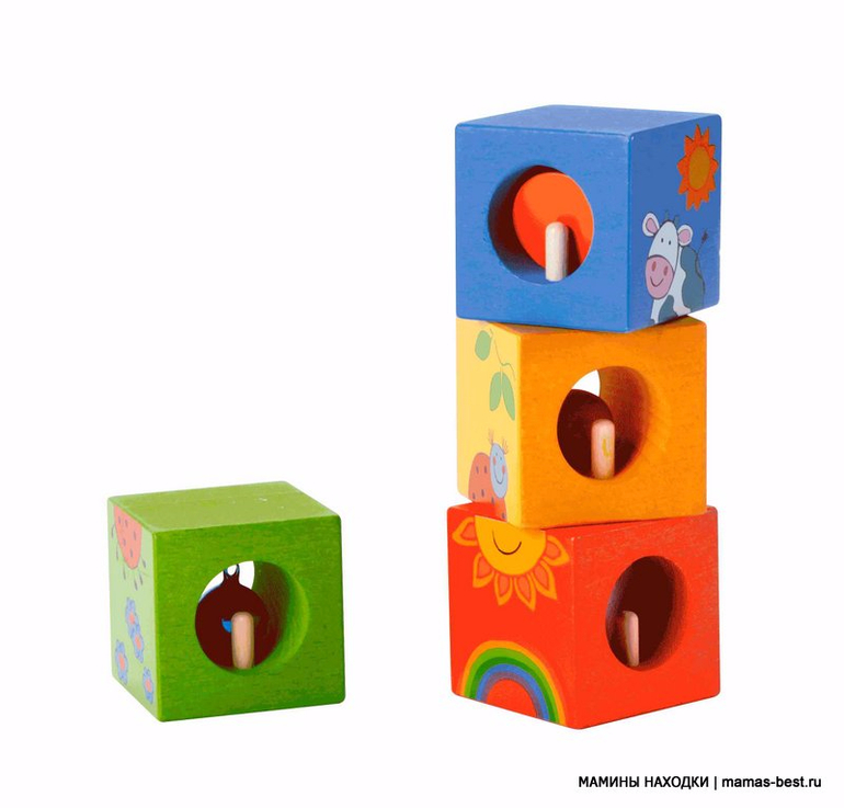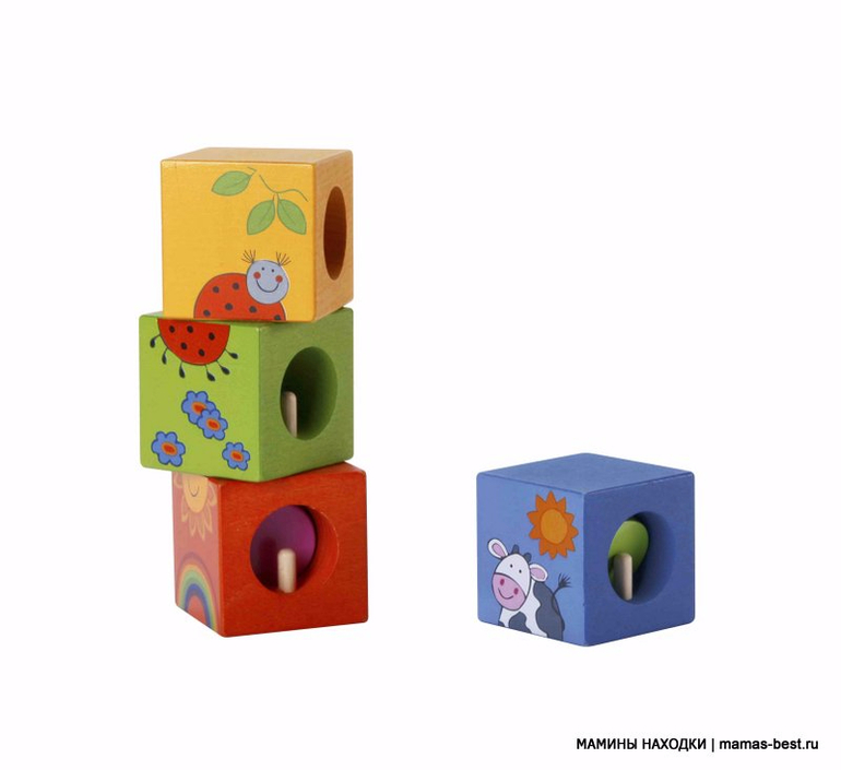 Каждый кубик это не только интересная игрушка для изучения окружающего мира и цвета, также он содержит разные звуковые эффекты внутри каждого кубика: бубенчик, деревянный шарик, деревянные трещётки. Скучно с такими кубиками точно не будет.