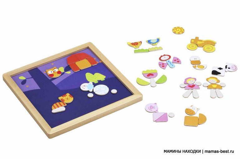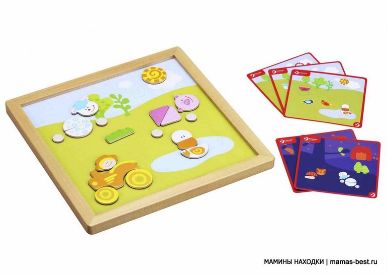 Собирайте занимательные магнитные пазлы по игровым картам, идущим в комплекте и в простой и занятной игровой форме изучайте форму, цвет, размер.
