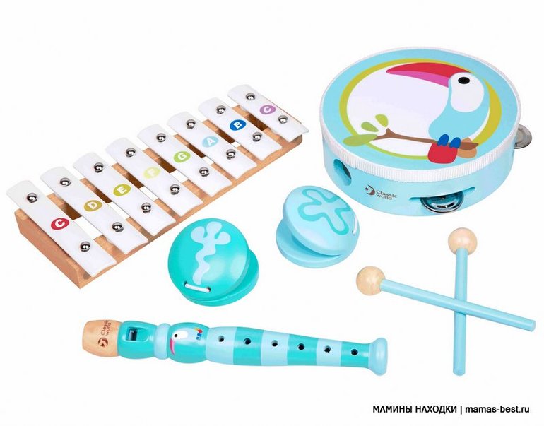 В красочном наборе представлены следующие инструменты: ксилофон с ударными палочками, звонкий бубен, мелодичная дудочка и зажигательные кастаньеты. Скучать точно не придётся!