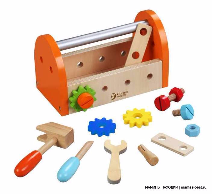 Маленький столяр придет в восторг от игрового набора с ящиком и инструментами из дерева. Теперь у папы и мамы будет отличный помощник!