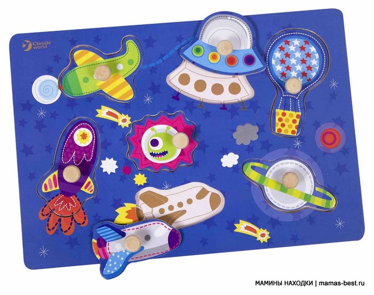 Первая Космическая Одиссей вашего ребёнка началась! Загадочные планеты, стремительная ракета, летающая тарелка - вот что ждёт вашего малыша во время игры с удивительным пазлом-сортером. Удобные деревянные ручки тренируют кисть ребенка, а подсказки на основе помогут справиться с заданием.