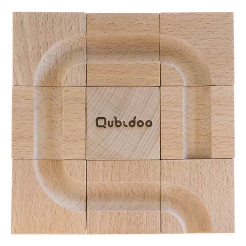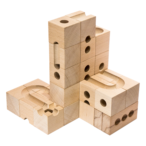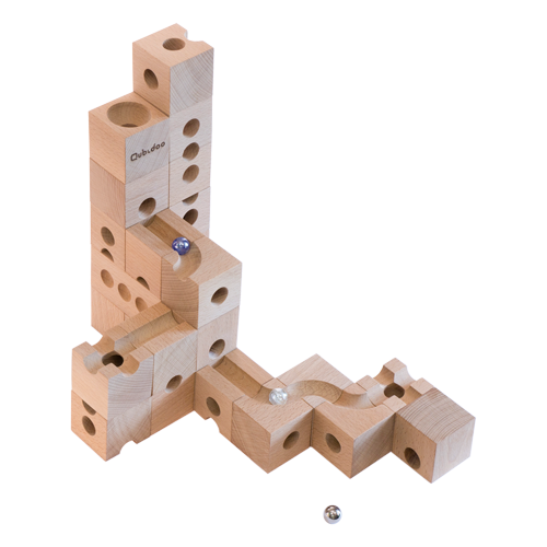 Конструктор из натурального бука содержит кубики 12 типов с различными отверстиями, тоннелями и желобами, а также металлические шарики из нержавеющей стали и более лёгкие - из стекла.